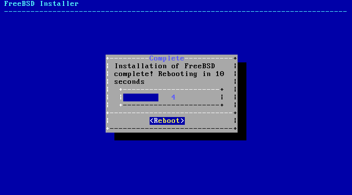 Экран с уведомлением о завершении установки операционной системы FreeBSD и дальнейшей перезагрузке ОС