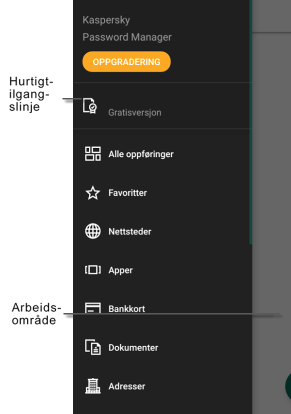 Appens hovedvindu består av hurtigtilgangslinjen og arbeidsområdet (se bildet under). Hurtigtilgangslinjen gir hurtig tilgang til funksjoner og innstillinger i Kaspersky Password Manager. Hvis du vil åpne hurtigtilgangslinjen, må du trykke